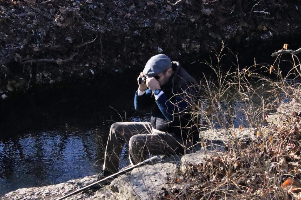 Sharon snapped this with her digital camera as he went old-school to photograph a stream profile.