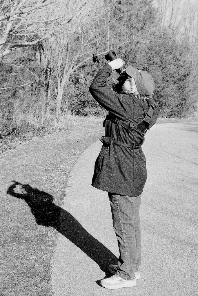 Rollie snapped this with his film camera as she panned and zoomed to capture wrens and chickadees in a tree just off the trail.
