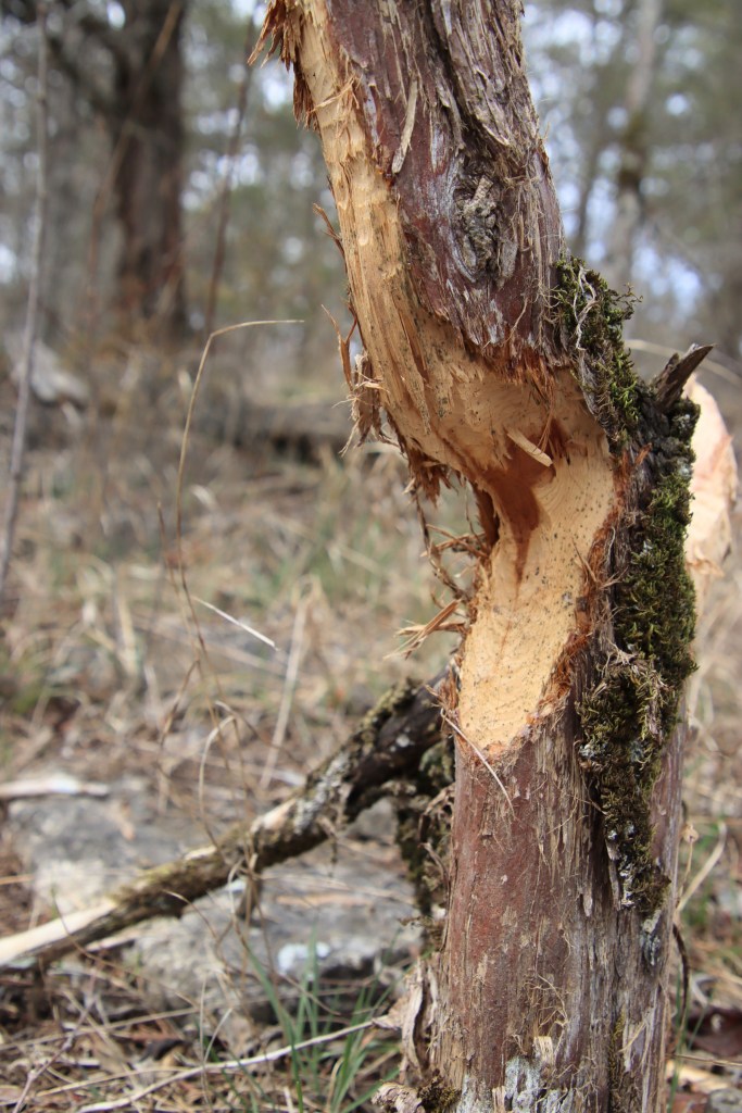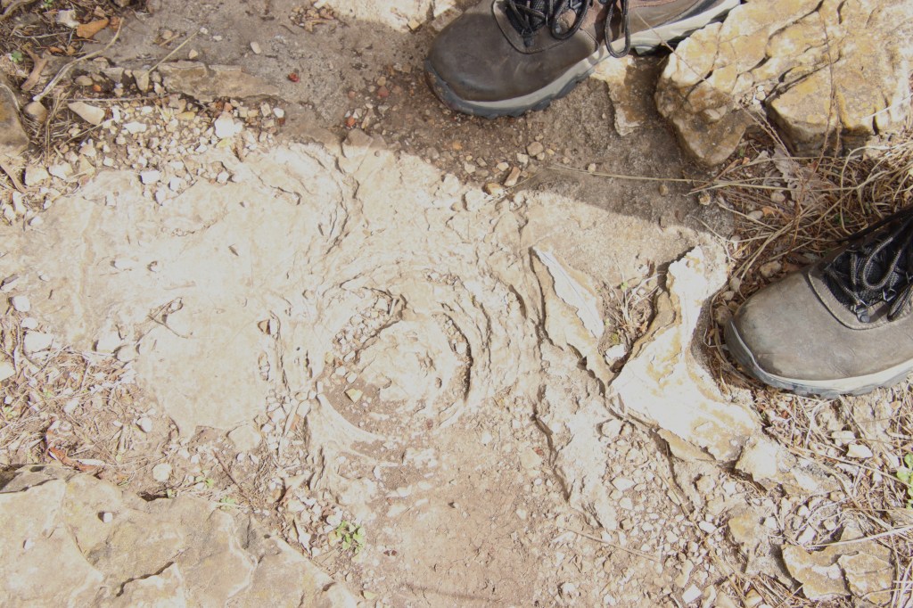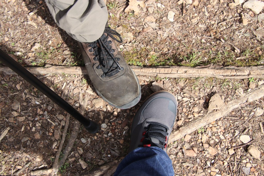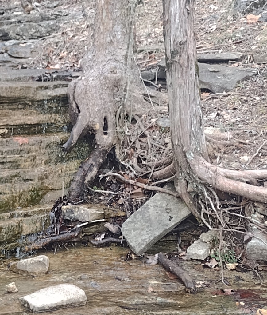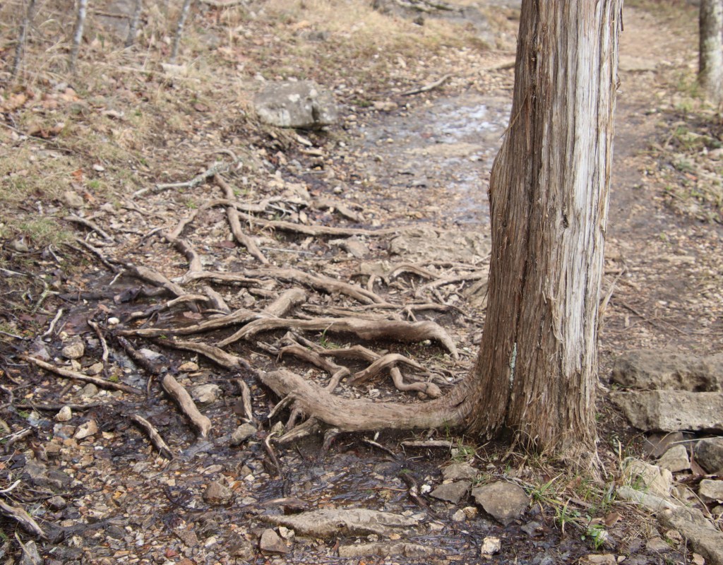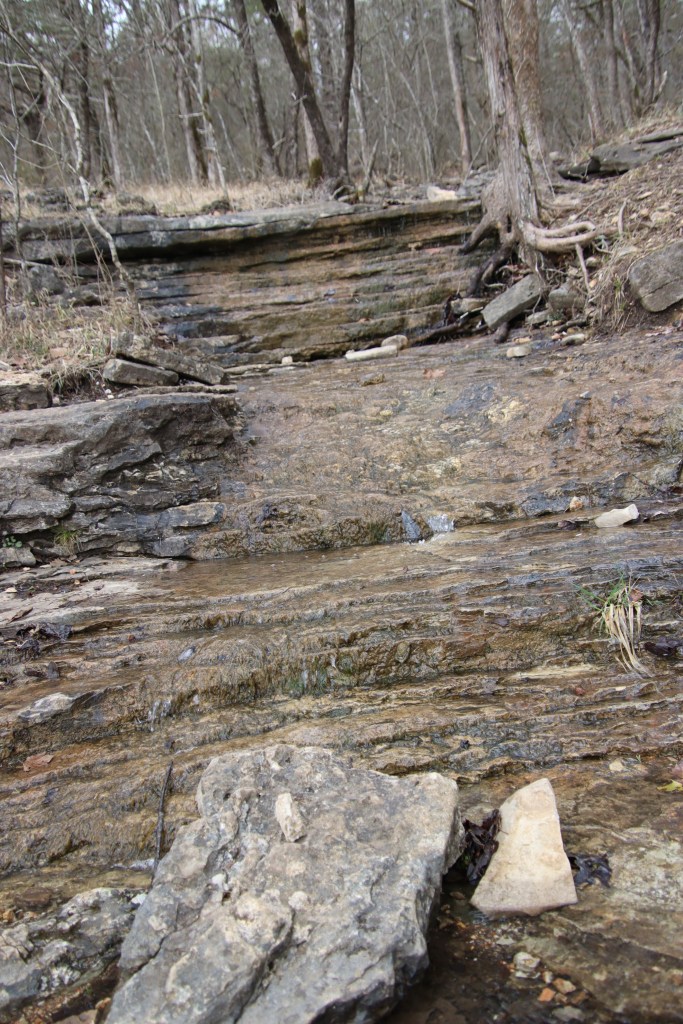 Canada geese were not too alarmed for continuing to feed just there on the shoreline.Rollie was shooting for an old structure we found, adding to a compiled project coming later in the year.Limestone and chert made for walkways, ‘stairs’ and habitat along the way.Stones, leaf litter and the moist, shady glades provided habitat for moss communities.This fern has held on through the winter in its rocky crag among lichens and mosses.Chert is known for round inclusions, evident along the trail.We were drawn to linger at this spring-fed series of tiny falls.Water rushes its inches of freefall off a tiny ledge, while a leaf holds on among slippery algae.Trees, water and stone all impact each other over a period measured by growth and erosion.Stone wasn’t the only floor of the trail, as these pine roots show.Up close and personal to a gnawed tree. Perhaps a muskrat was watching us.The buffeting breeze of the day meant many takes while this butterfly alit for a rest.Shooting star (?) flowers were blooming among sloped glade areas.These feet have seen, and will see more trails to share.