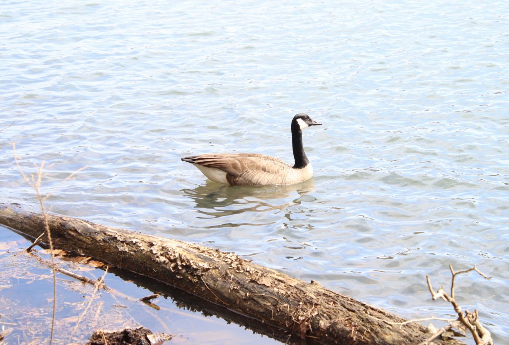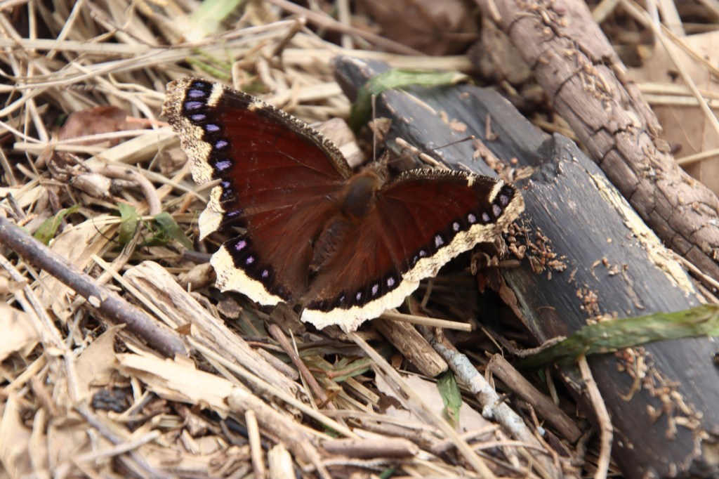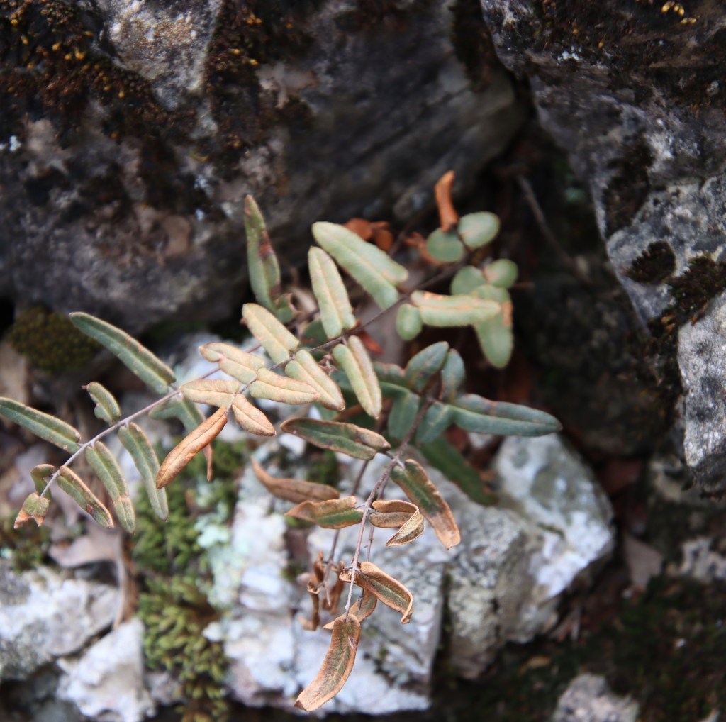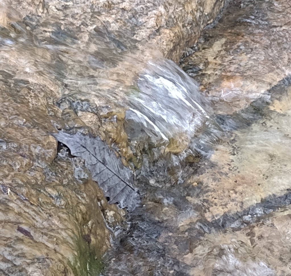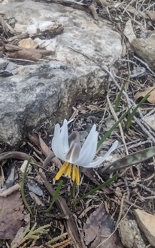 Canada geese were not too alarmed for continuing to feed just there on the shoreline.Rollie was shooting for an old structure we found, adding to a compiled project coming later in the year.Limestone and chert made for walkways, ‘stairs’ and habitat along the way.Stones, leaf litter and the moist, shady glades provided habitat for moss communities.This fern has held on through the winter in its rocky crag among lichens and mosses.Chert is known for round inclusions, evident along the trail.We were drawn to linger at this spring-fed series of tiny falls.Water rushes its inches of freefall off a tiny ledge, while a leaf holds on among slippery algae.Trees, water and stone all impact each other over a period measured by growth and erosion.Stone wasn’t the only floor of the trail, as these pine roots show.Up close and personal to a gnawed tree. Perhaps a muskrat was watching us.The buffeting breeze of the day meant many takes while this butterfly alit for a rest.Shooting star (?) flowers were blooming among sloped glade areas.These feet have seen, and will see more trails to share.