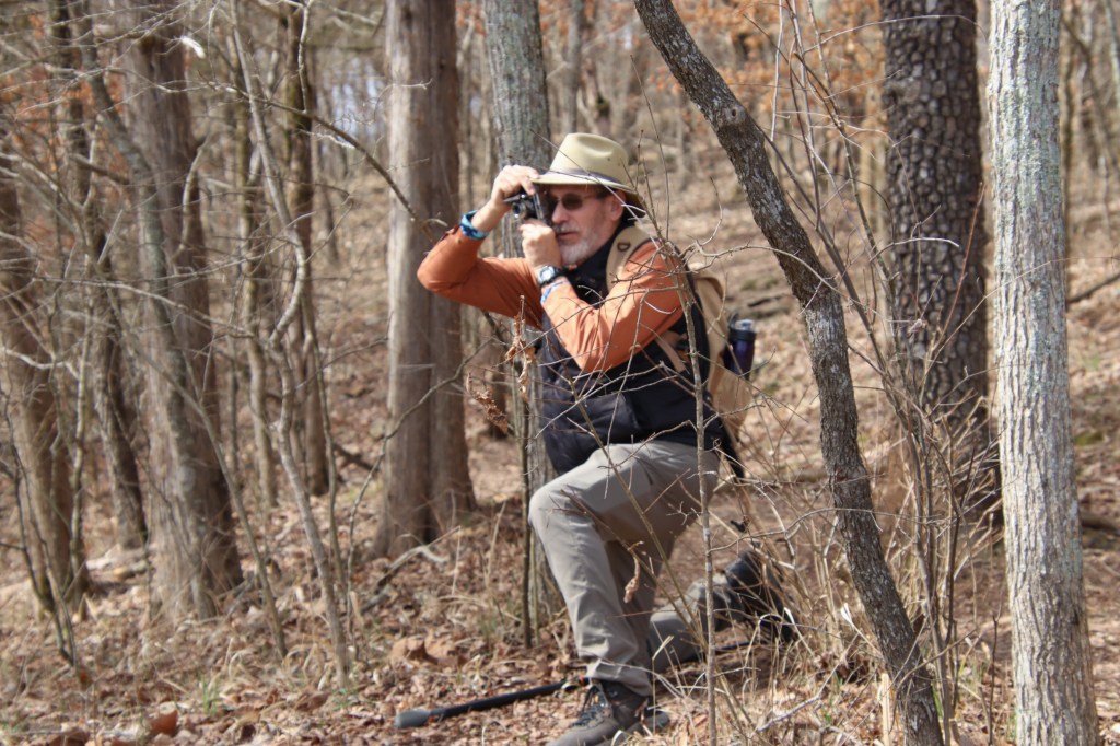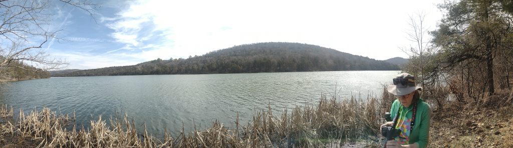Sharon checks camera settings, full manual today, along the Lake Leatherwood shoreline.