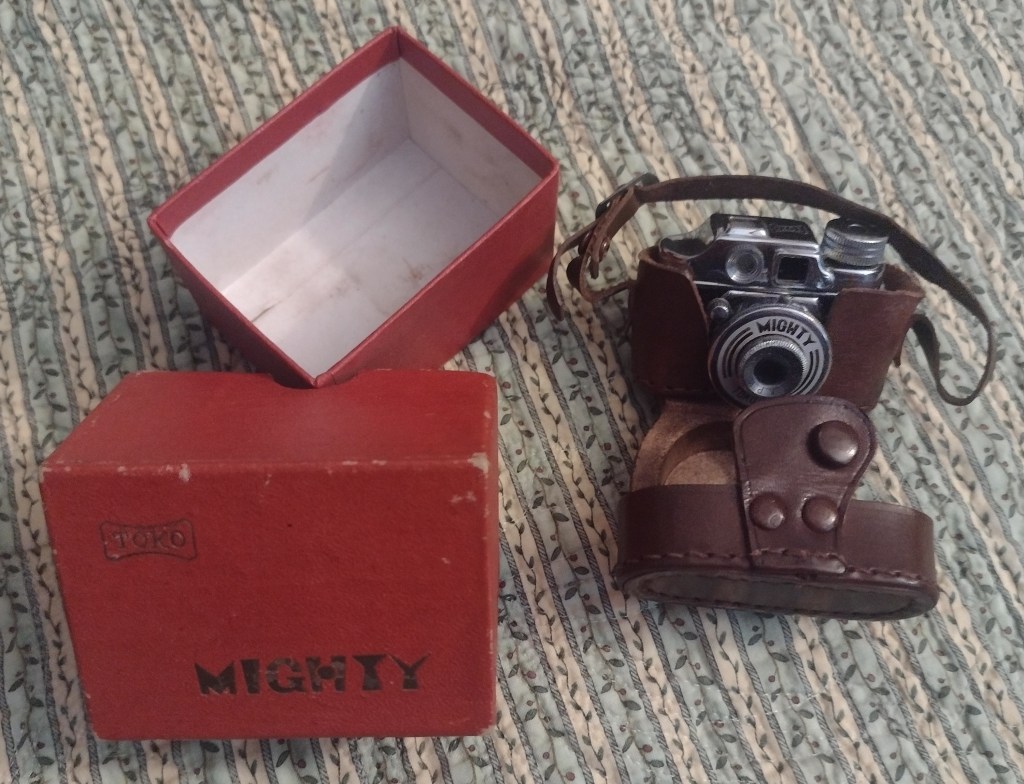 Any-who. Back to the family. Our newest baby is the Toko Mighty, a 1950s camera actually stamped with “Made in Occupied Japan.” Post WWII forces kept the nation from rebuilding military might. Much of the industrial complex and resources were destroyed by war. These cameras worked, and were made primarily of stamped tin, because of scarcity of iron and aluminum. A teeny roll of film could be prepared for still shooting pics with it.