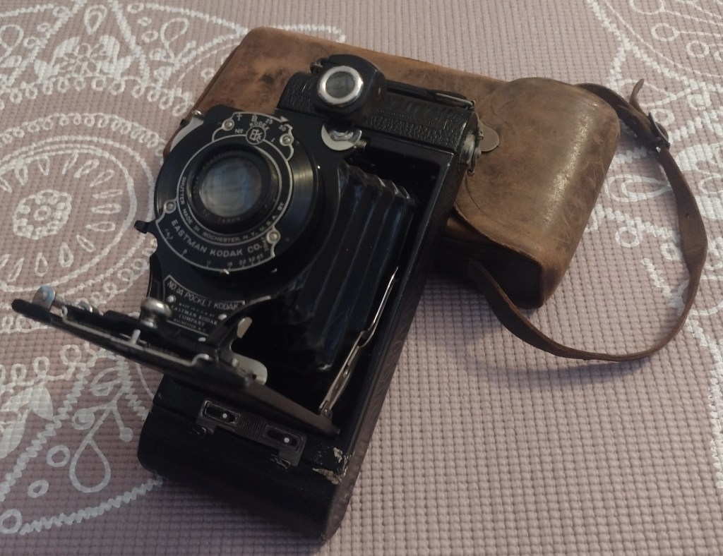 The big athlete of the family is the Kodak 1A Pocket Camera, from about 1926. Earliest versions of these Pocket Cameras were in people’s hands more than a century ago, thanks to Eastman Kodak. ‘Autographic’ film had been produced so that a tiny door on the back could be opened, and a caption scratched directly onto the film paper; the camera was held in the light for a time, and picture of the caption was recorded as part of the photograph.
