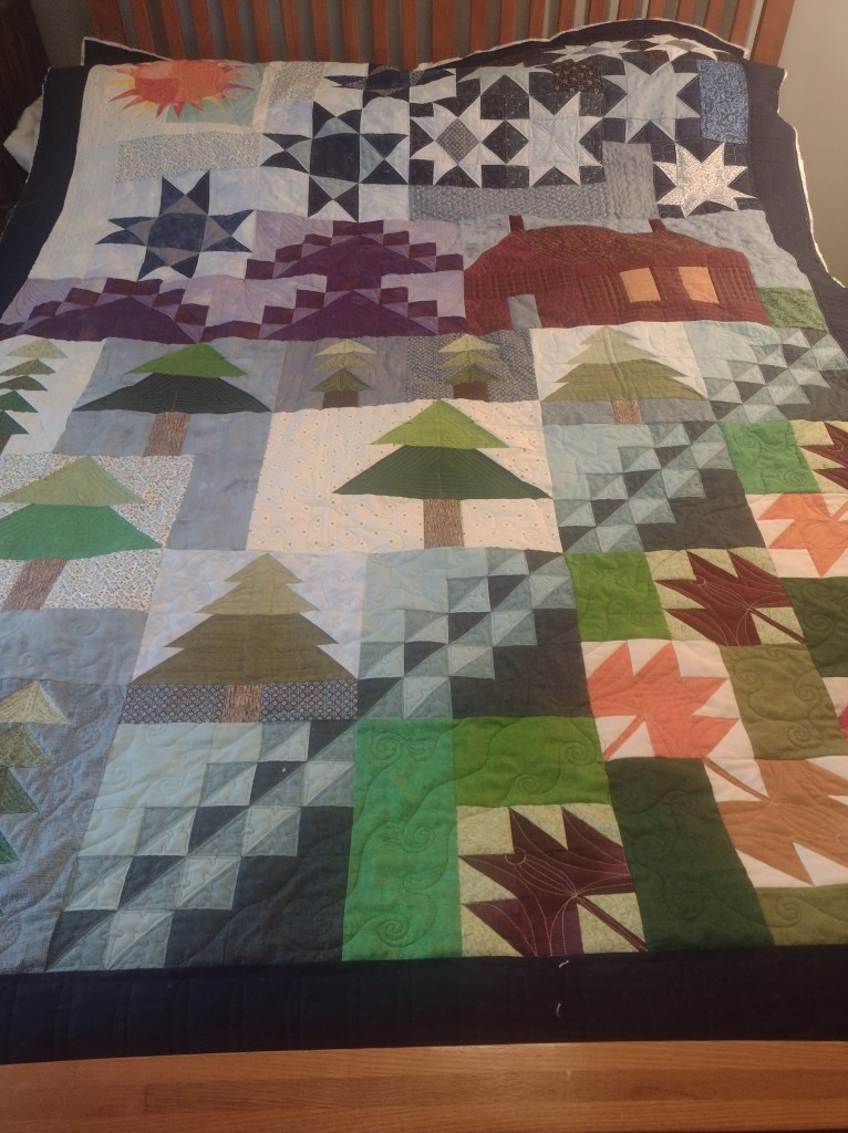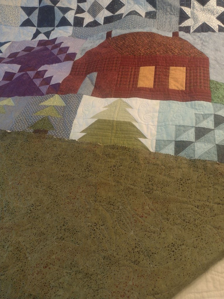 Another example is this recent quilt of a “Starry Night,” with mountain views around a remote cabin. I brought little flourishes of surrounding and movement to leaves, trees, the mountains, the cabin, stars, and even the cool night air.