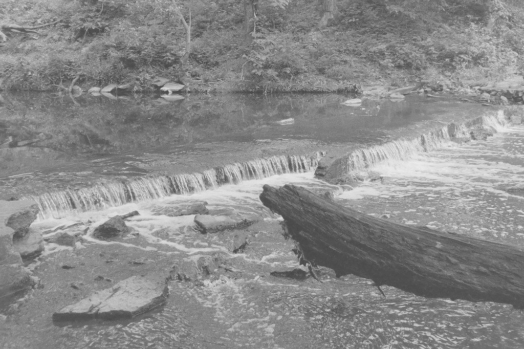 In modern setting, the I-435 highway, just in the planning when I was a kid, passes (its 8 or 10 lanes) right along Indian Creek, so you now hear the background thrums of passing cars. Also amazing, the old farmlands were built up into an irregular set of commercial office buildings, Corporate Woods, with bike trails and a goal of preserving the natural environment as much as possible. I have a pic around here of bringing Sharon and our daughters to the weir some twenty years ago, and it hasn’t changed much from what they saw, either. I’ll find that sometime.