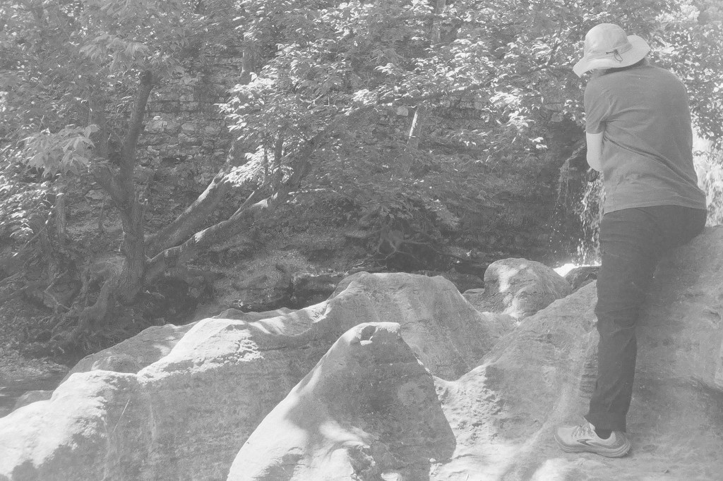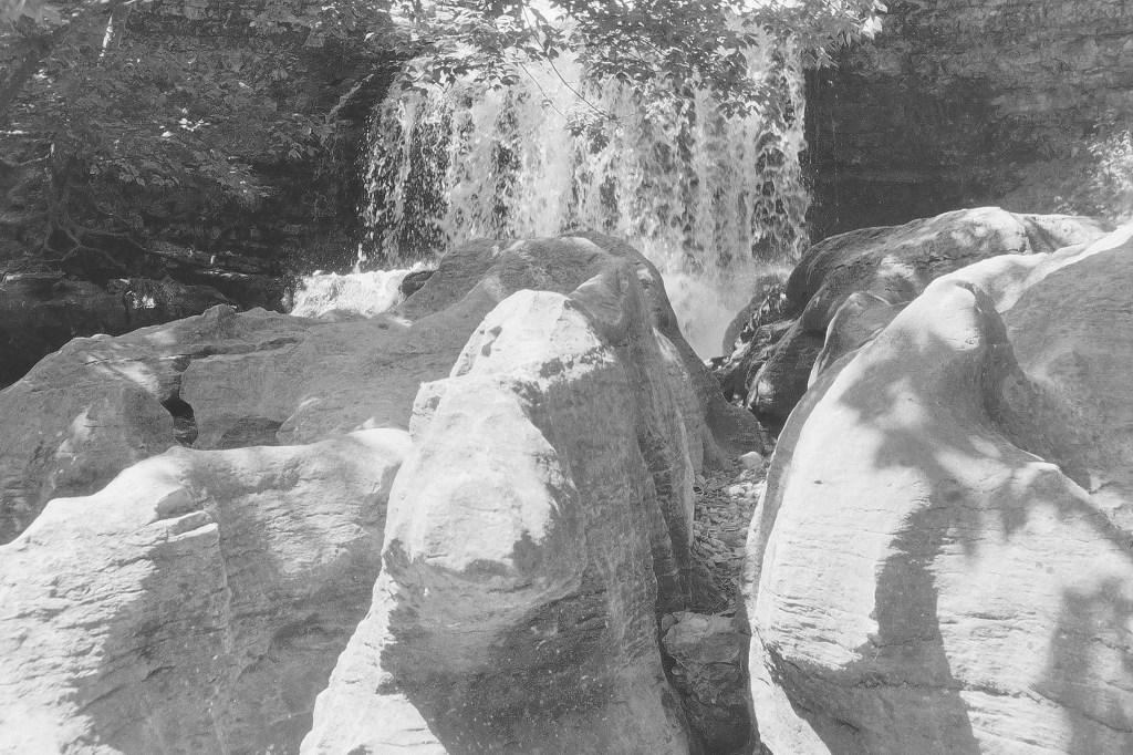 We found a much larger, higher falls area that we had naively never explored! Draining an impounded lake in the old valley, water has etched different prints in the rock here, than at the lower, stepped falls we have frequented. More direct, pummeling power has impacted the limestone in its randomized dash, changed at times by winds and floods.