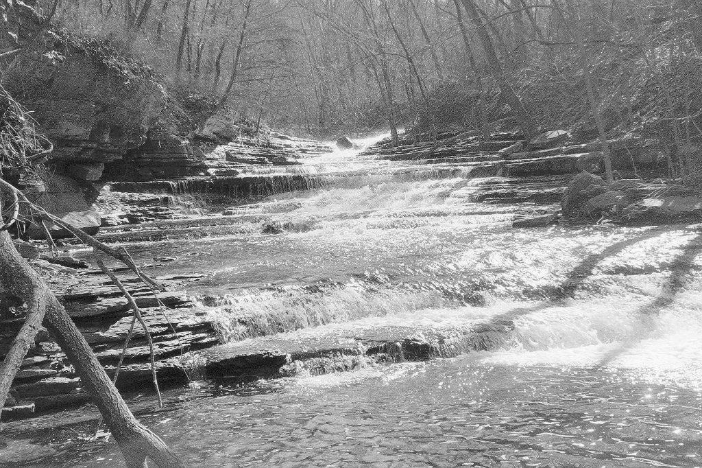 Sharon and I ventured to a surprise new viewpoint of wind, water and rock last week. Wind was there, but not a major player. We visited Tanyard Creek in northwestern Arkansas. We’ve been there multiple times before, for short day hikes. That day we certainly stayed to look and listen to the wildly stepped rush of the creek, as it splashed down multilayered, eroded ozark limestone.